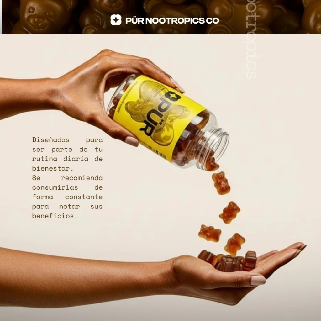 Cada frasco contiene 30 porciones (60 gomitas), formulado con extractos premium y puros: